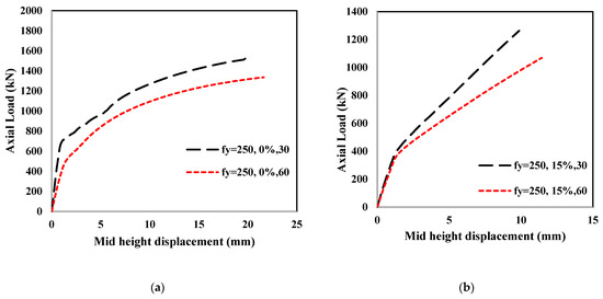 Figure 10 represents the axial load–mid-height lateral displacement curve of the hybrid columns. Mid-height displacement in the lateral direction of the circular column was obtained by taking a node on the outer surface of the column on the same side of the eccentric loading application. The hybrid columns showed a reduction in axial capacity due to increased bending moment. For 0% rubber content in Figure 10a, the capacities of fy = 250, 0%, 30 column with 30 mm eccentricity and fy = 250, 0%, 60 column with 60 mm eccentricity are 1552 kN and 1336 kN, respectively. The increase in 30 mm load eccentricity decreased the axial capacity by 13.92%.