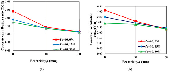 Variation in concrete contribution ratio (CCR) with load eccentricity. (a) Concrete strength 40 MPa. (b) Concrete strength 80 MPa.