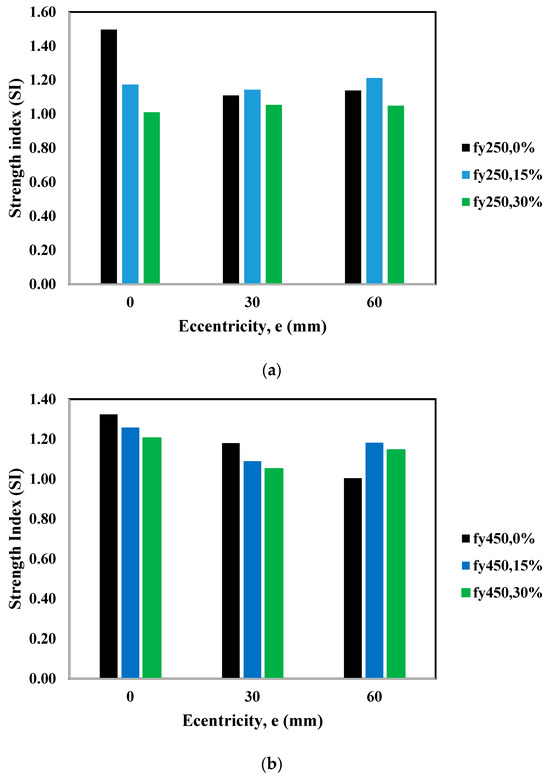 Comparison of strength index of rubberised concrete with load eccentricity: (a) fy = 250 group of specimens and (b) fy = 450 group of specimens.