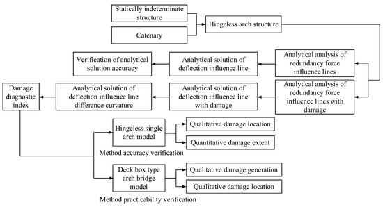 There is no analytical solution to the deflection influence line of catenary hingeless arches nor an explicit solution to the deflection influence line difference curvature of variable section hingeless arches. Based on the force method equation, a deflection influence line analytical solution at any location before and after structural damage is obtained, and then an explicit solution of the deflection influence line difference curvature of the structural damage is obtained. The indexes suitable for arch structure damage identification are presented. Based on analytical theory and a finite element model, the feasibility of identifying damage at a single location and multiple locations of an arch bridge is verified. This research shows that when a moving load acts on a damaged area of an arch structure, the curvature of the deflection influence line difference will mutate, which proves theoretically that the deflection influence line difference curvature can be used for the damage identification of hingeless arch structures. This research has provided theoretical support for hingeless arch bridge design and evaluation. Combined with existing bridge monitoring methods, the new bridge damage identification method proposed in this paper has the potential to realize normal health status assessments of existing arch bridges in the future.