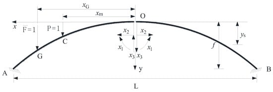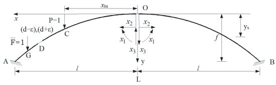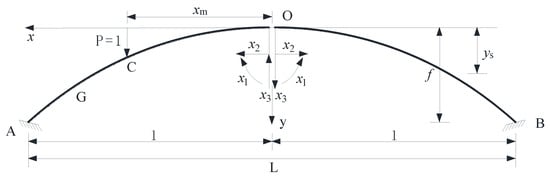 The hingeless arch is divided into cantilever arches with left and right symmetry by the force method, which is illustrated in Figure 2. The A and B represent the left and right arch foot of the hingeless arch. The mid-span redundancy forces are x1, x2, and x3. The elastic center method is used to simplify the force method equation, and the moving force coordinate of point C is set to xm.