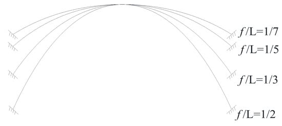 To identify the analytical accuracy of the deflection influence line derived in Section 2.2, a finite element model was established by taking four variable section catenary hingeless arches as examples; the calculated results of the derived deflection influence line were compared, and the relative errors of the analytical solution and the finite element numerical solution were compared. The span of the four arches is 40 m, and the rise–span ratios are 1/2, 1/3, 1/5, and 1/7, as depicted in Figure 6. The width of the arch rib section is 1 m, and the height of the mid-span arch section is 1 m. The section height changes according to the Ritter formula (Equations (4)–(6)), the elastic modulus of the material is 3.45 × 107 kN/m2, the arch axis coefficient m is 1.988, and the arch thickness change coefficient n is 0.4. The deflection influence lines of L/2 and L/4 sections for formula analysis and finite element calculation in this paper are illustrated in Figure 7, Figure 8, Figure 9 and Figure 10, and the numerical results of typical sections are depicted in Table 5.