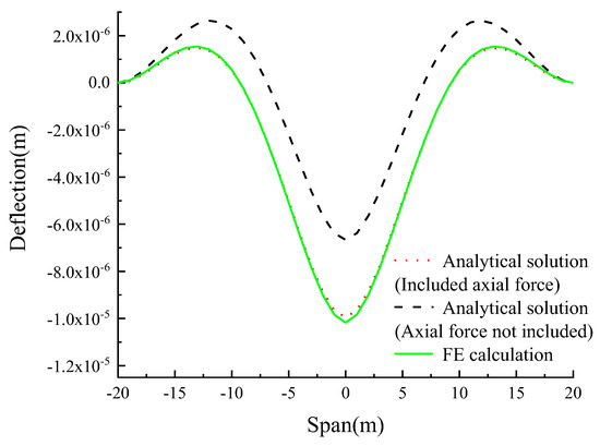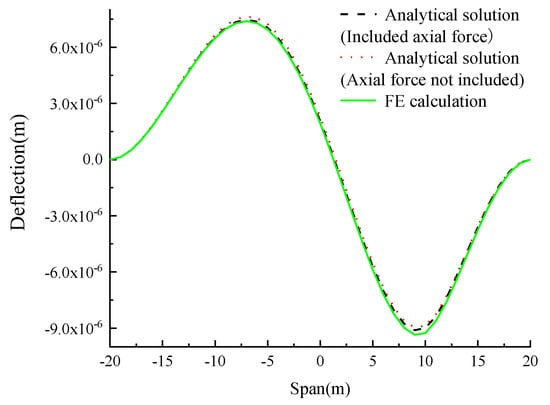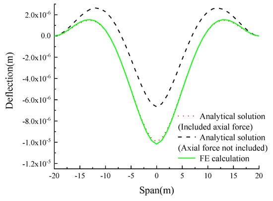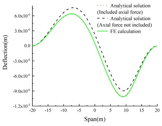 From the analysis of Table 5, Figure 7, Figure 8, Figure 9 and Figure 10, it can be seen that for arch axes with different rise–span ratios, when the axial force is considered, the deviation between the deflection influence lines analytical solutions of the four kinds of variable cross-section catenary hingeless arch in the calculation examples, and the result of the finite element calculation is less than 6%.
