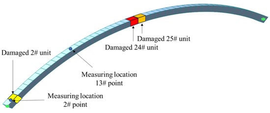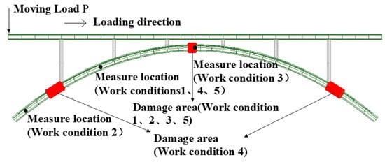 Next, we explored the damage identification effect of DILDC on the deck-type box arch bridge. According to the damage of the main arch ring of the main load-bearing component in practical engineering, five damage conditions are established, as illustrated in Table 8 and Figure 24.