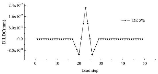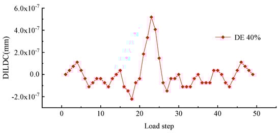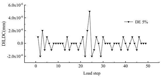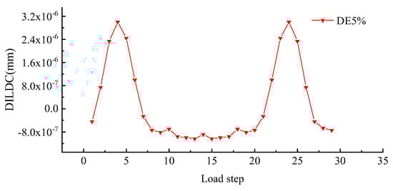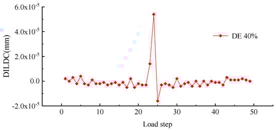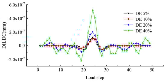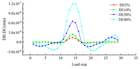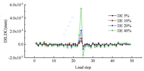 To better explore the effect of measuring location and unit damage extent on DILDC damage identification, the DILDC index curves of 40% damage and 5% damage extent in Work condition 1 and Work condition 2 were compared, respectively, as illustrated in Figure 17, Figure 18, Figure 19 and Figure 20 (unit: mm).
