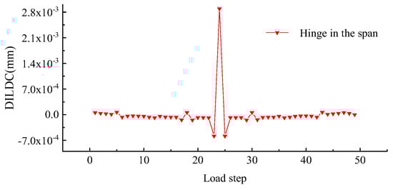 In Work condition 4, the rigid joint is weakened into a hinge to simulate the plastic hinge in the actual structure. The DILDC value of the damage location is substituted into Equation (30), and the calculated damage extent x is 90.95%, which is close to 100.00% in the case of complete damage.
