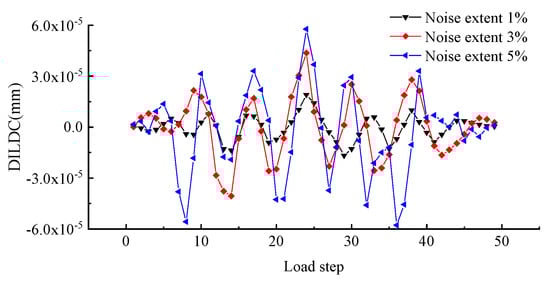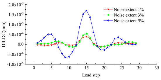 where denotes the deflection data extracted from the measurement location under the loading step, denotes the deflection data containing noise at the loading step, denotes a random number that follows a standard normal distribution, denotes the noise extent level, and superscript indicates that the quantity value has included the introduced noise information. The damage index is constructed using the deflection data containing noise to verify the noise immunity of the proposed method.