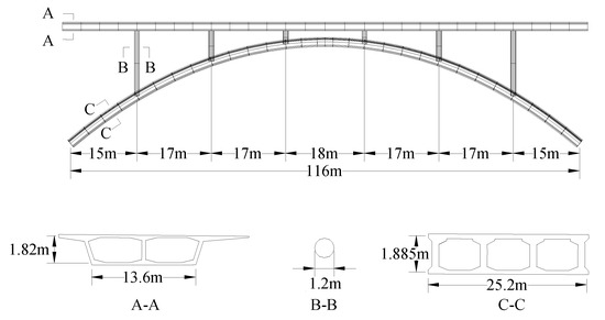 Given that the hingeless arch bridge has the advantages of great overall rigidity, convenient construction and low maintenance cost, it is widely used in practical engineering. However, temperature changes, material shrinkage, structural deformation, pier displacement and other factors lead to the subsidence and cracking of the main arch ring. The occurrence of these conditions usually leads to a reduction in the local rigidity of the structure [1]. The main arch rib and main arch ring are the main load-bearing structures of arch bridges [2]. Once the arch rib or main arch ring is damaged, the bearing capacity of an arch bridge will decrease greatly, or the bridge may even collapse [3].