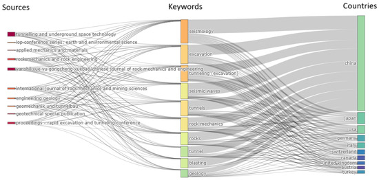 The figure visually represents the intricate web of research connections among three fundamental keywords: “seismic”, “excavations”, and “tunnel.” Drawing insights from the comprehensive Scopus database, this figure offers a comprehensive glimpse into the state of research in this interdisciplinary field. The diagram prominently highlights China, Japan, the United States, and Germany as the leading countries actively engaged in seismic, excavation, and tunnel studies. These nations exhibit a substantial research presence and contribute significantly to the advancement of knowledge in this domain. Noteworthy keywords in this research landscape include “seismology”, “excavation”, “tunnel”, and “seismic waves.” The frequency of these keywords underscores their central importance in the body of research covered by the Scopus database. The diagram also underscores the significance of key scholarly journals in disseminating research in this field. Notably, “Tunneling and Underground Space Technology Journal”, “Chinese Journal of Rock Mechanics and Engineering”, and “Journal of Rock Mechanics and Rock Engineering” serve as prominent conduits for the exchange of knowledge and findings.