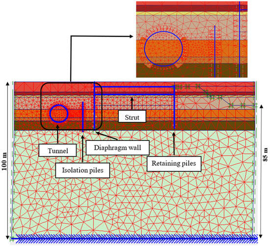 Young’s modulus was set at 30 GPa, and Poisson’s ratio was set at 0.2 for modeling the tunnel lining, diaphragm wall, isolation piles, and contiguous piles in PLAXIS 2D v20. When simulating the diaphragm wall and struts, five-node plate elements and three-node bar elements were used, respectively, while 6933 fifteen-node triangle components were used to model the soil. Plate elements were used to model the contiguous piles and isolation. The impact of the vertical interaction can be ignored because the horizontal load is carried by the adjacent piles. To prevent adding more convergence forces, plate elements were employed to simulate the adjacent piles. To account for the influence of the segment joints on the tunnel lining’s rigidity, the transverse effective rigidity ratio was set at 75%. The boundary conditions are constrained for horizontal displacement and set free for vertical displacement at the peripheral project boundary. Both horizontal and vertical shifts have been fixed to the lower bound of the model. Figure 3 shows the arrangement and the mesh used in the mathematical modeling. In the model, a fine mesh is used. In addition, we used the “refine cluster” option in PLAXIS 2D around some elements, such as walls and tunnels, to have more accurate analyses. The groundwater level was −2 m, which was eliminated in one analysis.