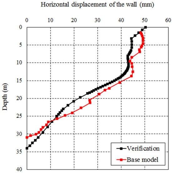 Comparison between the horizontal displacements of the diaphragm wall obtained from Zheng’s study and the current research.