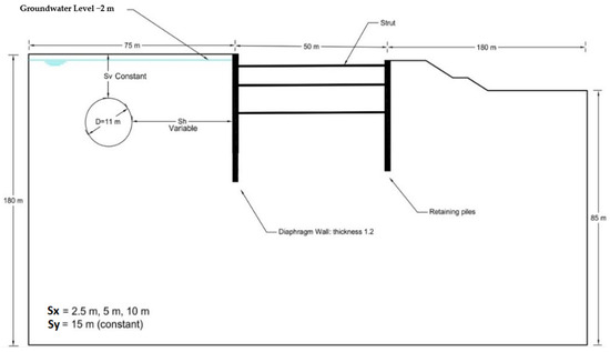 For the purpose of validating the finite element (FE) model in this study, a meticulous examination of a braced excavation in Tianjin City, China, has been selected as the foundational model [16] (Figure A1). The excavation, situated in close proximity to an existing tunnel, comprised three principal and partial depths: 15 m, 16.25 m, and 17.55 m. Notably, the excavation was located on the south side of the tunnel, with the closest point a mere 16.5 m from the tunnel.