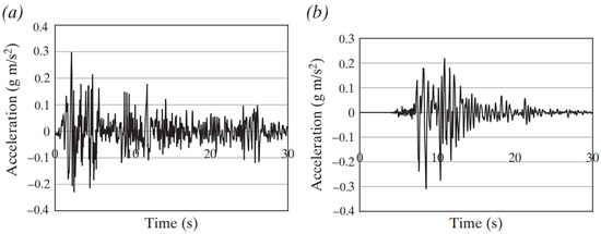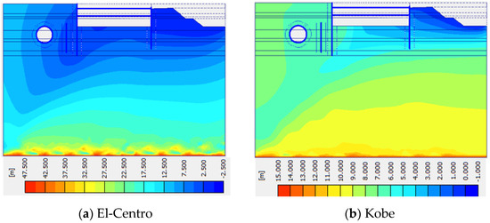 Several influencing factors were considered to investigate the effect of the dynamic loads on diaphragm wall responses, including the earthquake duration and acceleration. Table 1 provides a summary of a number of scenarios that were derived utilizing the dynamic loads. The model was constructed from the steps list of the Tianjin, China, model with the same parameters in PLAXIS 2D. To consider the model in the absence of water before activating step 1, the whole model was dewatered, which is the last step in all models considered for dynamic loads. This study modeled dynamic loads from the bottom of the model. In another step, the effect of tunnel displacement on the diaphragm wall was investigated, which is modeled in the presence of water and the El Centro earthquake. As presented in Figure 5, the tunnel’s vertical displacement (Sy) was constant in this model, and the horizontal displacement (Sx) was variable by 2.5, 5, and 10 m. Figure 6 also depicts the input waves used in the analyses of the current study, considering the El-Centro earthquake and the Kobe earthquake [31].