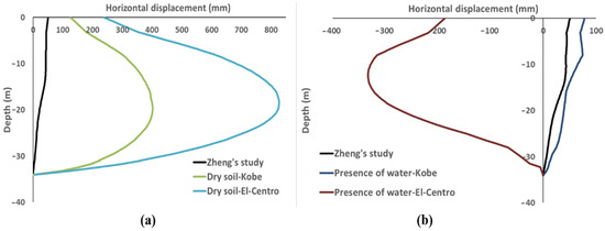 Horizontal displacement of the wall versus depth curve for all models: (a) dry soil and (b) presence of water.