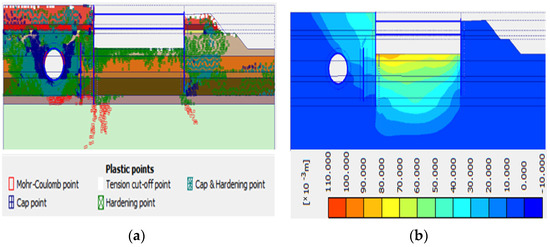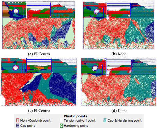 A green square with a plus sign (hardening point) denotes sites on the shear hardening envelope for the hardening soil and HSS models as well (mobilized friction envelope). A green crossing square, on the other hand, functions as both a cap point and a hardness point. A comparison between Figure 8a,b illustrates that the plastic points increase when dynamic loads are induced on the model, which increases significantly in the presence of water. It is worth mentioning that the higher duration of the El-Cento earthquake load caused more plastic points in the model compared to the Kobe load. Plastic points are spread evenly in soil layers in the absence of water, which is concentrated and compressed, and are moved to top areas, especially cap points and Mohr-Coulomb points, in the presence of water. The density of points is significantly higher around the elements and excavation areas.
