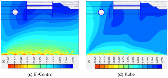 Inducing the El Centro earthquake, the diaphragm wall’s horizontal displacements are noticeable. The greatest possible horizontal displacement in the absence of water happened at 20 m from the top of the wall head, which was about 820 mm, and the head of the diaphragm wall moved 180 mm (Figure 7a). The diaphragm’s horizontal displacement was assumed to move in the opposite direction in the presence of water. The highest horizontal displacement happened at 13 m from the wall head, or about 332 mm, and the wall’s head moved 186 mm (Figure 7b). Inducing Kobe’s earthquake load led to a maximum horizontal displacement of 20 m from the wall head, or about 401 mm, in the absence of water. In contrast, the head of the wall has about 125 mm of horizontal displacement. Figure 7b illustrates the diaphragm wall horizontal displacement in the presence of water, leading to 78.25 mm in the wall head and 74.7 mm in 8 depths from the wall head. Figure 7a shows that the maximum horizontal wall head displacement was about 50.8 mm in static conditions. The displacement increased by inducing a dynamic load, which was different in the absence and presence of water. Inducing the El Centro earthquake’s seismic load, the wall head moved about 186 mm in the presence of water, while the corresponding value was about 78 mm for the Kobe earthquake. Respectively, the movements were 236 and 125.8 mm without water. As mentioned, the magnitudes of the Kobe and El Centro earthquakes are approximately the same, while the El Centro earthquake duration is almost twice that of Kobe (Table 1).