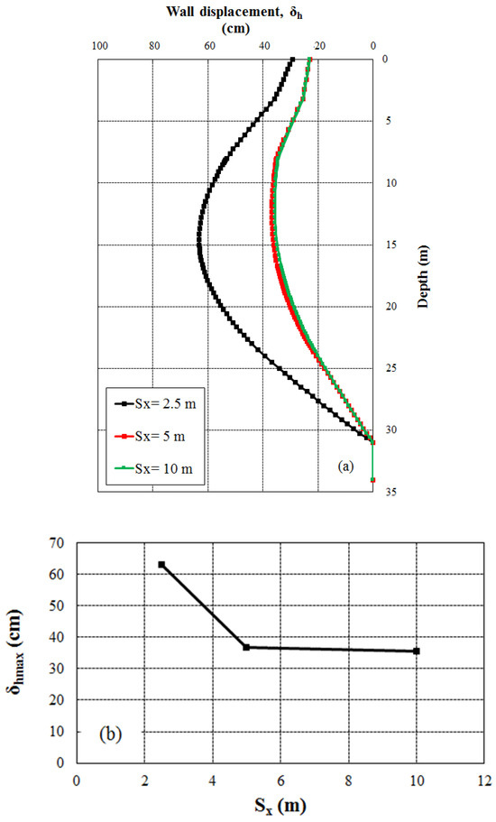 The diaphragm wall’s displacement for various values of Sx: (a) The profiles of the wall’s horizontal displacement and (b) the maximum horizontal wall displacement relative to Sx values.