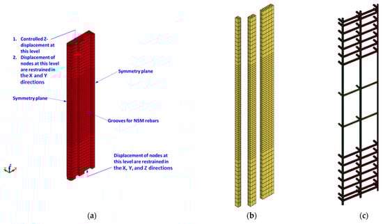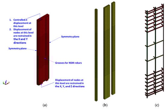Elsanadedy et al. [24] conducted a study to come up with an efficient scheme, without section modification, for strengthening existing RC wall-like columns employing a hybrid of NSM and CFRP wrapping systems. Six half-scale specimens were subjected to concentric compression testing. Two of these columns remained unretrofitted, serving as reference, while the remaining four were upgraded using different schemes. Among the four schemes explored, the most efficient approach involved the use of continuous NSM rebars in combination with CFRP wrapping, resulting in an impressive 80% increase in the ultimate load. Additionally, nonlinear FE analysis was employed to assess the response of the tested columns. The test results closely aligned with the FE analysis, confirming the accuracy of the constitutive models employed for different materials. In another companion study, Elsanadedy et al. [25] studied the axial strengthening of wall-like RC columns using another four different configurations. These schemes were also without shape modification, and they incorporated the use of GFRP wrapping alone, GFRP wrapping combined with bolted steel plates, or GFRP wrapping combined with connected (or disconnected) NSM bars. Nonlinear FEA was also performed to predict the response of columns.