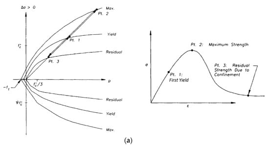 Table 2 reports the vital input values of the constitutive models used in the FE analysis. The damaged concrete model type 72R3 [36,38,39,40] was used to model both concrete and mortar. Figure 12a illustrates this model, in which three individual surfaces (yield, maximum, and residual) are used to define the deviatoric strength. The modeling of steel bars, rods, and plates involved the utilization of the piecewise linear plasticity model type 24 [36], which is characterized by a bilinear stress-strain curve illustrated in Figure 12b. For the modeling of FRP sheets, the enhanced composite damage model type 54–55 [36] and the application of Chang and Chang failure criteria [41] were employed.