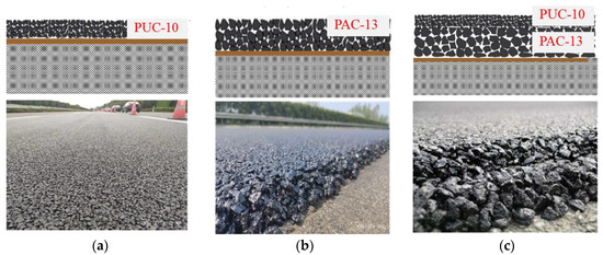 Porous asphalt mixtures. (a) PUC-10 (10~30 mm). (b) PAC-13 (40~50 mm). (c) PUC-10 + PAC-13 (20~40 mm + 35~60 mm).