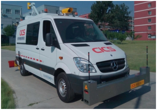 The CiCS on the multifunctional automatic pavement detection vehicle comprises road surface detection equipment independently developed by our institute, shown in Figure 3. It passed the SCANNER certification organized by the Transport Research Institute in the UK in 2012, and it can output 40 road condition indicators, including DR, RD, IRI, SFC, SMTD, etc. Its effective detection speed is 0~100 km/h. The frequency of the sensor is 20 kHz/s. The coefficient of variation is 1.6~3.6%, and its correlation is 0.992~0.998.