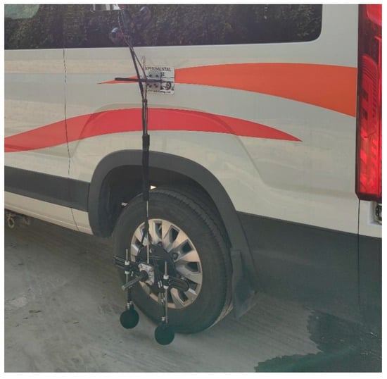 According to the American Association of State Highway and Transportation Officials (AASHTO T 360-16) [36], the noise of the section was tested with the OBSI method. The test vehicle was a light passenger car, and standard reference test tires (SRTT) were utilized. A pair of sound intensity sensors were arranged at both the front and rear ends of the tires. The distance of the sensor from the tire sidewall was 101.6 mm, and the height from the pavement surface was 76.2 mm. The two sensors were arranged symmetrically on both sides of the center line of the tire axle, with a horizontal distance of 209.6 mm and a standard speed of 97 km/h during the test. The device is shown in Figure 4. The noise intensity of the different lanes and the different pavement structures given in Figure 1 were measured.