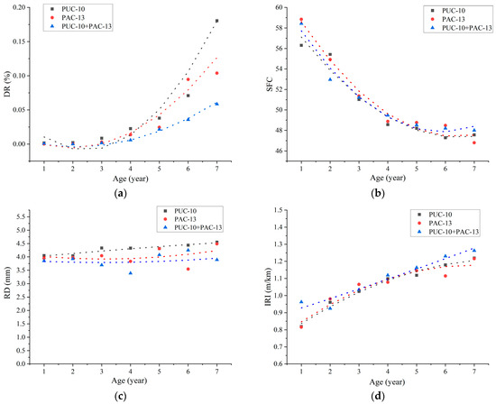 - The DR and SFC of the three porous asphalt pavements diminished significantly with the increasing age of the pavement, while the IRI and RD exhibited no remarkable reduction. The SFC had a relatively obvious decline over 1–4 years of operation, with a decrease rate of 13.8–17.0%.