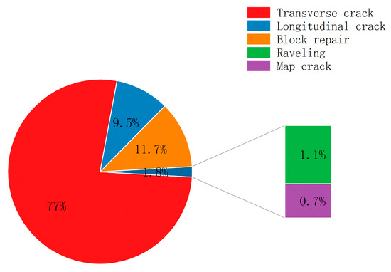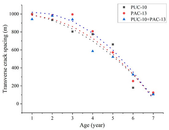 According to Figure 5, different pavement structures exhibited various characteristics of pavement service performance. The DR of the three porous pavement structures increased to a certain extent with time, and the DR of PUC-10, PAC-13, and PUC-10 + PAC-13 remained higher after 7 years of application. The proportions of different types of damage distress are plotted in Figure 6. It indicates that transverse crack distress is the main damage distress type of porous asphalt, accounting for about 77%. The TCS results and the typical porous pavement distresses are shown in Figure 7 and Figure 8. It is found that after three years of construction, the crack spacing of each pavement structure was greatly reduced, indicating that the transverse cracks of porous asphalt develop rapidly after three years of operation. They are the main reason for the increase in the DR.