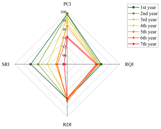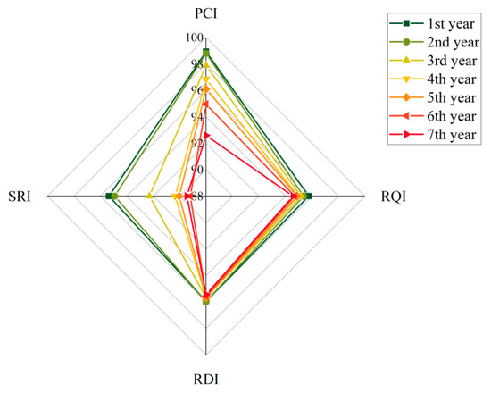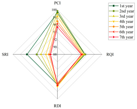 During the 1–7 years of service, the performance of the porous asphalt pavement declined to a certain extent, among which the PCI and SRI showed the most notable decrease. The PCI of the three porous pavement structures dropped to 92.59–95.34, and the attenuation rate reached 3.93–6.41% compared with that in the first year. This is because the porous asphalt pavement has a higher connected porosity. Compared with a dense pavement surface, a porous asphalt mixture is more susceptible to aging and water damage, and its crack distress develops faster, resulting in a greater decrease in PCI. The SRI of the three porous pavement structures decreased to 88.72–89.45, and the attenuation rate ranged from 6.17% to 7.93%, which is mainly affected by factors such as aggregate angularity and polishing value [37,38]. Under the repeated action of vehicle load, the micro-texture of the coarse aggregate was reduced, resulting in a decrease in its skid-resistance properties. The RQI of the three porous pavement structures was reduced to 94.42–94.58, with an attenuation rate of 0.99–1.24%, and the RDI dropped to 95.45–96.31, with an attenuation rate within 0.6%. This is because the porous asphalt mixture has a skeleton-pore structure, and the coarse aggregates are embedded within each other, and thus, the pavement shows better resistance to deformation. Therefore, the RQI and RDI did not decay greatly.