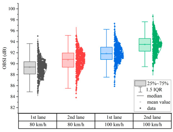 According to Figure 12, at the test speed of 100 km/h, the average OBSI values of the noise of the first and second lanes were 91.86 dB and 93.50 dB, respectively, which were remarkably higher than those at the test speed of 80 km/h (89.35 dB and 90.63 dB). At the test speed of 100 km/h, the average OBSI value of the first lane was increased by 2.51 dB compared with that at 80 km/h, while that of the second lane was increased by 2.87 dB. This indicates that the OBSI is greatly impacted by the test speed; the faster the driving speed, the greater the OBSI value. At the same speed, the average OBSI value of the second lane was 1.64 dB (100 km/h) and 1.28 dB (80 km/h) higher than that of the first lane, respectively, suggesting that the OBSI value of the second lane was slightly greater than that of the first lane at the same test speed. Based on the box plot, the interquartile spacing [3/4 quantile (75% quantile value)—1/4 quantile (25% quantile value)] of the second lane was slightly greater than that of the first lane. This means that the OBSI dispersion of the second lane is greater than that of the first lane, which may be caused by the pavement condition indicators of each lane.