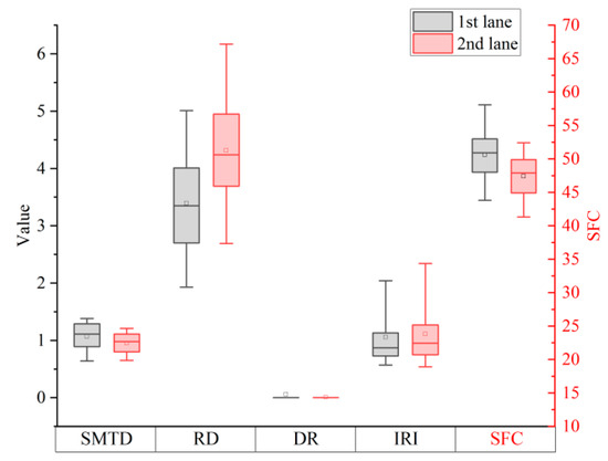 To understand the influence of different lanes on the pavement condition indicators, the distribution statistics of the test data of the SMTD, RD, DR, IRI, and SFC corresponding to the section tested by the OBSI with a length of 5 km were calculated. The results are shown in Figure 13. It was revealed that the average values of the SMTD and SFC of the first lane were higher than those of the second lane; the RD and IRI were lower than those of the second lane; and the DR values of the two lanes were basically 0. This indicated that the service performance of the pavement of the two lanes is satisfactory, and the service performance of the first lane of the pavement is better than that of the second lane. The average IRI value of the two lanes was slightly greater than the median, and its distribution range of quantile spacing of 75–95% was much greater than that of 5–25%, indicating that there were more points with large IRI values, which may be one of the main causes of tire/pavement noise. Therefore, the pavement condition indicators of different lanes are different, and poor service performance of the pavement is one of the main reasons for greater noise levels.