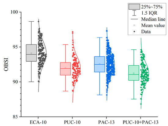 To clarify the influence of different pavement structures on the OBSI, the OBSI test data from lengths of 5 km were classified by different pavement structures, as shown in Figure 14. It was manifested that under the same test conditions, the OBSI noise level of the three porous pavement structures was greatly lower than that of the dense gradation pavement. The three porous pavement structures had better noise reduction properties. Compared with the DTC, their OBSI noise could be reduced by 2.09 dB, 1.53 dB, and 2.88 dB, respectively. The PUC + PAC had the best noise reduction effect compared to the other two porous pavement structures, with an average OBSI value of 91.23 dB. This is because it has a two-layer porous asphalt structure, and the connected pores are not easily clogged by dust during the pavement service, producing a more durable noise reduction effect. The OBSI of the PAC-13 was slightly higher than that of the PUC-10, and its standard deviation and interquartile spacing were higher than those of the other two pavement structures. This implies that a greater dispersion of OBSI values is caused by a larger connected porosity and better pavement service performance during service.
