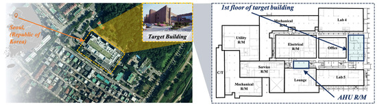 The target building is located in the southwest of central Seoul, Republic of Korea, as shown in Figure 2. The three stories of the commercial building, which was built in the 1980s with a total area of approximately 32,278 m2, must be air-conditioned. As a typical multi-functional building, it contains several types of spaces, such as offices, research facilities, a data center, and meeting rooms. The building has 82 air handling unit (AHU) systems with different HVAC types (i.e., constant air volume (CAV) and variable air volume systems) and different installation dates. The target zone is approximately 594 m2, and the target AHU is one of the oldest ones in the building as described Table 1 and Table 2. Although the control parameters of the heat exchanger valve of the PID controller were adjusted in 2017, the occupants experienced frequent thermal discomfort, in particular during the cooling season.
