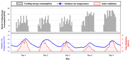 Figure 5 shows the hourly cooling energy consumption based on representative five days operation data from 1–5 August 2021 during a cooling period compared with the outdoor air temperatures, solar radiation, and cooling energy consumption provided by the initial model with the construction and operation information. During the experimental periods, the average daily temperature and solar radiation were 23.66 °C and 0.66 MJ/m2, respectively, and the daily average cooling energy consumption was 119 kWh. Notably, the change in cooling energy consumption does not correlate with the outdoor air temperature and solar radiation under specific criteria during air-conditioned schedules because of the absence of windows and the influence of the room temperature of the adjacent room. The cooling energy consumption has a significant impact on maintaining the set temperature (23.5 °C ± 0.5 °C) in all periods. After that, system identification and calibration of the building simulator in hourly intervals is performed for the representative five weekdays.