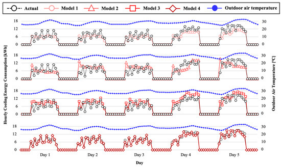 Figure 6 shows the results of correction with the actual cooling energy consumption for each iteration of the virtual simulator (the conditions of estimated parameters presented in Table 3). Models 1 and 2 differ greatly from the actual values for building energy consumption by more than 50% on average, with respective values of 0.569, −0.905 and 0.422, +0.901 for CV(RMSE) and MBE, respectively, as described in Table 3. The performance degradation of Models 1 and 2 appears to be due to exploring the search space in the initial learning process. However, the calibration performance dramatically improved from +0.901, 0.422 (Model 2) to +0.244, 0.393 (Model 3) for CV(RMSE) and MBE, respectively. This enhancement can be attributed to lower thermal efficiency (i.e., reduced infiltration and thermal mass) and increased SHGC of the window compared to Model 2. Notably, Model 4 outperformed other models with CV(RMSE) of 0.231 and MBE of 0.087, both of which satisfy the hourly acceptance criteria of ASHRAE Guideline 14 (i.e., within 30% for CV(RMSE) and 10% for NMBE). Model 4 demonstrated energy performance similar to real buildings by applying optimal envelope parameters, including reduction in insulation thickness and high infiltration compared to initial condition.
