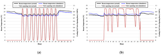 During regular daily operations, the cooling coil valve often transitions between a closed state (0) and a completely open state (1) based on the indoor air temperature. During days of high demand, the valve remained fully open to accommodate increased cooling demands. When the control variables (, , and ) of actual conditions are used as inputs of a simulator, the room temperature and valve position of the virtual simulator are similar to real conditions for a representative two days (i.e., typical day, peak day) within 0.043 and 0.053, respectively, of CV (RMSE). The simulator shows reliable performance even with irregular valve positions on the peak day. This means that simulator characteristics of the building envelope and HVAC system effectively reflected the actual conditions.