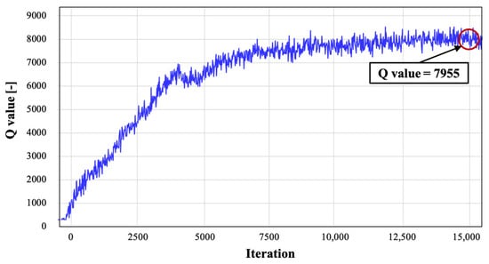 Figure 8 shows the changes in Q-value in the reward function according to the simulation epoch. As the Q-value in the initial state is zero, the Q-value increases when another epoch is added; it converges to 7955 after the epoch reaches 15,000. Ten experiments were performed while changing the initial conditions in the same batch state; the results are similar, and the number of epochs at which the reward values converge is constant. Table 5 shows the initial values of the variables and Q-values with different major epochs. The convergence time is approximately three hours, making it feasible to achieve convergence during the period from the end of the air conditioner operation (7:00 p.m.) to the system restart (5:30 a.m.).