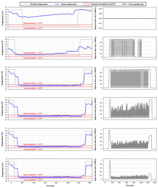 Figure 9 shows room temperature with the changes in the valve opening positions driven by , , and of the DDPG algorithm, as listed in Table 5. The DDPG algorithm explores a feasible boundary with high fluctuations in valve positions during the initial learning process (i.e., iteration = 0–9000). The room temperature shows reliable performance within the boundary after 3000 iterations; however, the fluctuation of the valve opening rate decreased as the training progressed. The room temperature and change of the valve opening positions are more stable with high Q-values, after reaching 9000 iterations. Notably, the values change into zero values after many training epochs. This is because the zone is not so small that it can reflect the control signal right away for the system to change its operation. In the convergence point (i.e., = 18.71, = 10, and = 0.01), room temperature successfully retains the set indoor temperature (i.e., 23.5 ± 0.5 °C) with a low range of valve positions at 0–20%.