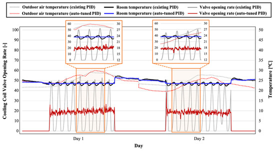 Figure 10 shows the experimental results of the existing PID and auto-tuned PID operating conditions of the HVAC system for the representative two days. The outdoor air conditions of selected representative days showed similar patterns; the daily average outdoor air temperature ranged 19.67–29.90 °C and 21.86–29.10 °C under the existing PID conditions and auto-tuned PID conditions, respectively. The valve opening positions on a daily average are similar to maintaining the indoor set temperature (23.5 ± 0.5 °C) during the building operation at 18.15% and 18.82%, respectively. The variation in the cooling valve opening position of the existing control ranged from 0% to 54.5% at the peak cooling demand. However, the valve position of the auto-tuned PID ranged from 15.4% to 38.2% at the peak. The auto-tuned PID can maintain a stable valve position of less than 20% in the daily cooling operation. It illustrates the existing CAV system may be operating under oversized conditions due to changes in internal load conditions (occupancy, lighting, and plug), and specifies the suggested process that can adopt the HVAC system control to actual indoor thermal responses. In addition, it means that the auto-tuned PID control achieved precise control of indoor thermal comfort with minimal valve opening rate. The room temperature was also stable at 23.62 ± 0.3 °C compared to existing PID operating conditions (i.e., between 22.23 and 24.35 °C). In existing PID conditions, there is a high fluctuation of room temperature because of frequent outdoor air intake. Therefore, the auto-tuned PID control would be a more effective strategy for maintaining indoor comfort with stable operation of the HVAC system.