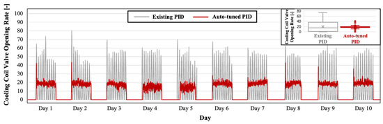 Figure 11 shows the valve opening rate with actual and improved operating conditions over a 20-day period. The cooling coil opening rate reached a maximum point in a trade-off between return air and fresh outdoor air on most days under both conditions. In a long-term test period, the valve opening positions ranged from zero (i.e., fully closed) to 80.42% under the existing PID operating conditions; it averaged a 19.15% opening rate during operational hours ( = 18.94). On the other hand, the valve opening rate under auto-tuned PID conditions ranged from 10.20% to 43.40%, 17.41% on average ( = 12.08). This can be attributed to the fact that the auto-tuned operating conditions can reduce deviations in the valve opening rate, thereby stabilizing the valve positions.