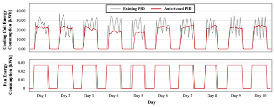 Figure 12 illustrates the energy consumption of the cooling coil and fan at 15-min intervals under existing and auto-tuned PID conditions for 20 days. Under auto-tuned PID conditions, the cooling coil energy consumption (energy saving rate) reduced by 18 kWh (13.71%) over 10 days, while the fan energy consumption increased by 0.02 kWh (1.77%). The cooling coil achieved the highest daily energy saving of 18.59% compared to existing PID conditions on Day 3, with an outdoor air temperature around 27. This is attributed to maintaining a consistent valve opening of the cooling coil with the system’s operating time compared to existing PID conditions. The fan energy consumption remained at an identical level with the system’s operating hours because of the CAV system, which ensured there was no variation in fan power.