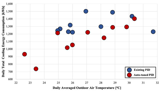 The optimal HVAC system is essential to maintaining building energy performance as well as improving indoor thermal comfort. Figure 13 compares the cooling energy consumption averaged daily under the existing PID and auto-tuned PID operating conditions during a period of 20 days. In general, the actual energy consumption of the existing control was higher at 131 kWh than the improved conditions (i.e., 113 kWh) averaged daily. The auto-tuned PID controller can achieve energy savings of 13.71% on all days within the outdoor temperature range of 25–31 °C.