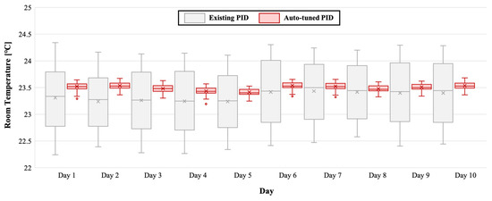 Figure 14 illustrates the distribution of daily room temperature during building operating hours for a period of 20 days. In the existing PID operating conditions, room temperature frequently exceeded the cooling set point temperature compared with auto-tuned PID conditions during experimental periods. Application of the existing system had a range of room temperature from 22.30 °C to 24.40 °C (median temperature—23.41 °C) with high deviations in the air-conditioned schedule; however, when using the auto-tuned system, room temperatures ranged from 23.25 to 23.65 °C (median temperature—23.51 °C) with a stable deviation. Thus, the auto-tuned PID control not only maintained the low energy consumption, but also performed a high level of indoor temperature management. The proposed model provided room temperature satisfaction (23.5 ± 0.5 °C) of 97% in 10 days but, room temperature satisfaction was 49% in existing conditions, as described in Table 6. In addition, 36% of the room temperature has been maintained at under 23.5 °C, causing unnecessary cooling energy consumption.
