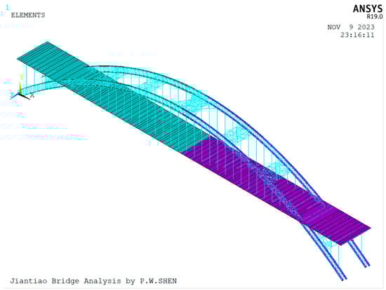 The calculation of the design load-bearing capacity of the Jiantiao Bridge utilizes the finite element software ANSYS. In the model, the arch ribs, the concrete inside the pipes, the transverse braces, the web members, the horizontal beams, and the columns are modeled using the beam44 element. The suspenders are modeled using the link10 element, and the upper and lower diaphragms, as well as the cast-in-place segments of the bridge deck, are modeled using the shell63 element. The finite element model established is shown in Figure 4.