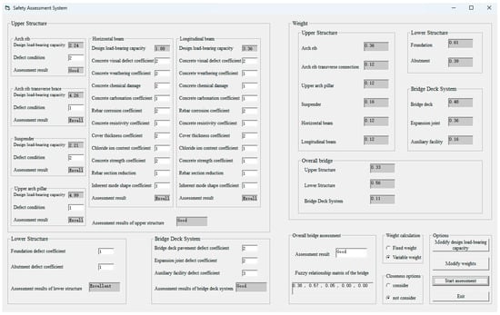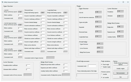 During the routine management and maintenance process of CFST arch bridges, a maintenance engineer only needs to conduct targeted inspections based on the various items listed in the software. They can refer to the scoring criteria provided in references [,] to rate the components and enter the scores into the assessment software. The program can automatically calculate the assessment results for the bridge and its components based on the data input by the surveyors. By considering the overall bridge assessment results and the fuzzy relationship matrix, management and maintenance engineers can make judgments on the bridge’s safety and decide whether necessary repair and reinforcement measures should be taken to address any structural damage.