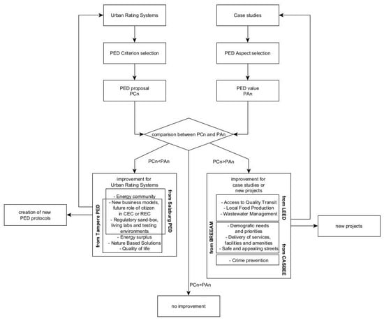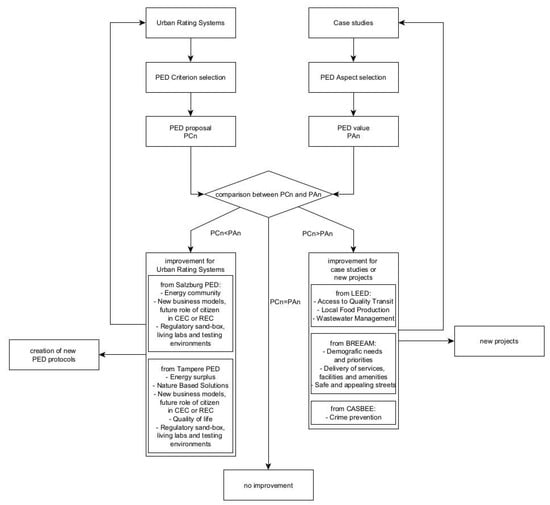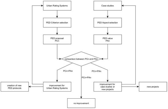 Flowchart of the methodology used, where PCn is the n-th PED criterion selected in an urban rating system and PAn is the n-th PED aspect selected from a case study. Produced by the authors.