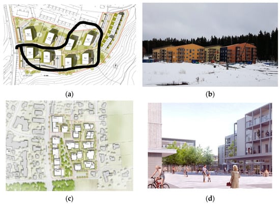 (a) Plan of Salzburg Geneis district; (b) photo of Salzburg Geneis district; (c) plan of Tampere, Ilokkaanpuisto district; (d) render of Tampere, Ilokkaanpuisto district.