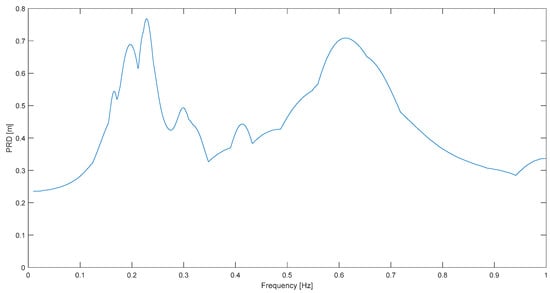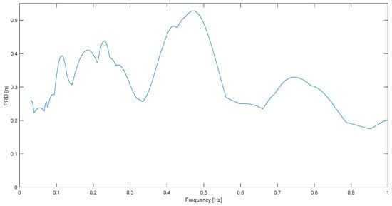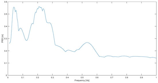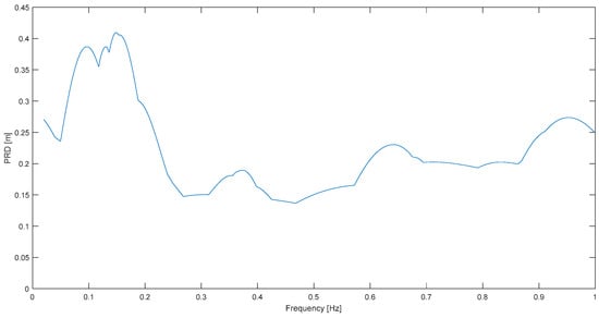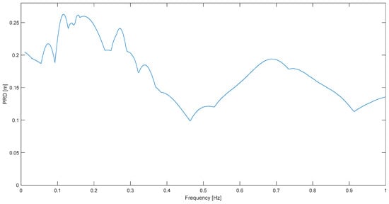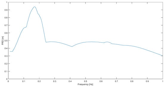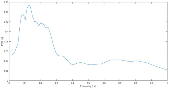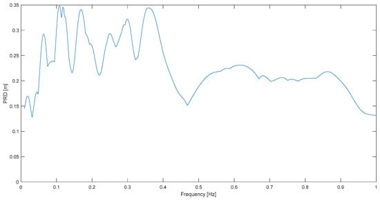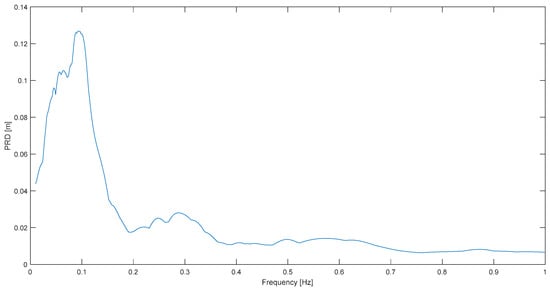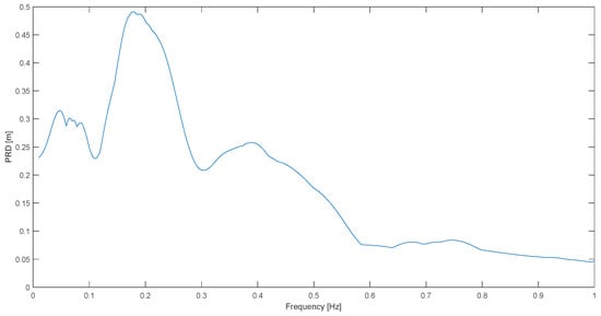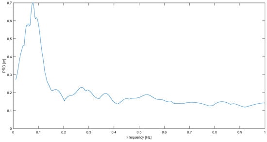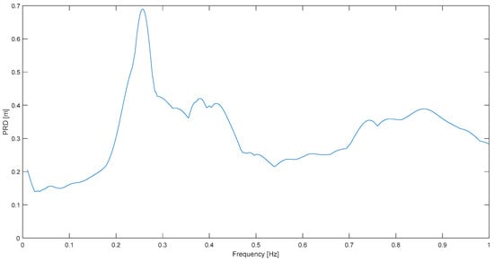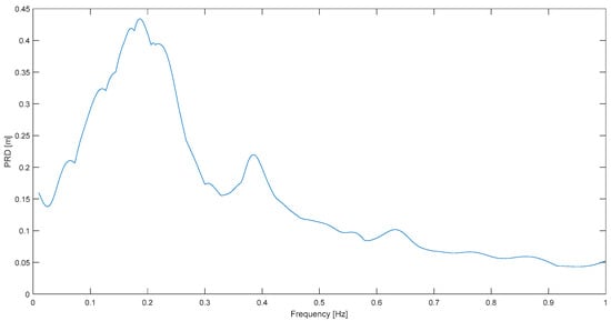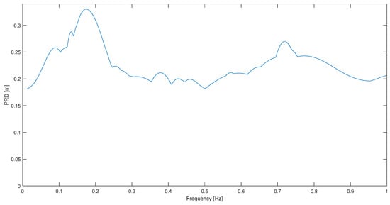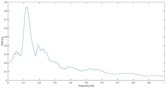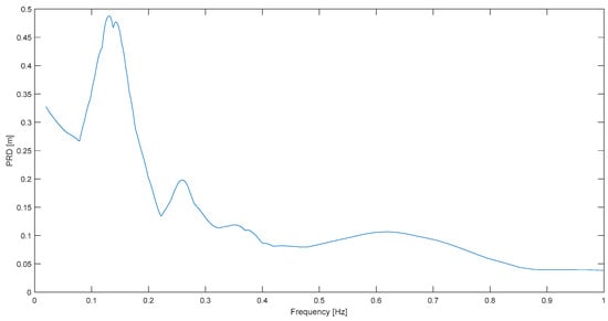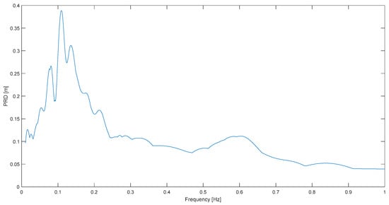 Therefore, a study of seismic predominant frequencies that is not based either on the problematic ground displacement or on the usual input or output acceleration that does not render positive results is proposed. It is proposed that the analysis or predominant period definition be based on the displacement response spectrum concept, whose computation involves a more reliable ground acceleration record. Specifically, resonant or predominant frequencies will be searched for in displacement response spectra. The hypothesis of this research is that clear resonant frequencies will be observed because neat predominant frequencies exist in Fourier or power spectra of ground displacement [,]. A theoretical basis for this, based on a generalized transmissibility concept, has been given by Morales recently (2023) []. Therefore, deformation response spectrum plots will be constructed, and an evident and clean predominant frequency will be observed, as shown in Figure 1, where peak response displacement (PRD) is plotted against natural frequency (instead of natural period, which is the other option).