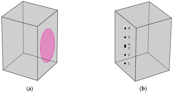 Scheme of using parts of a split sample of type (1A) to research the processes of concrete carbonation: (a) surface treatment with a 0.1% phenolphthalein solution; (b) points of sampling for physicochemical analysis (round points—SEM and XRD, square points—TGA).