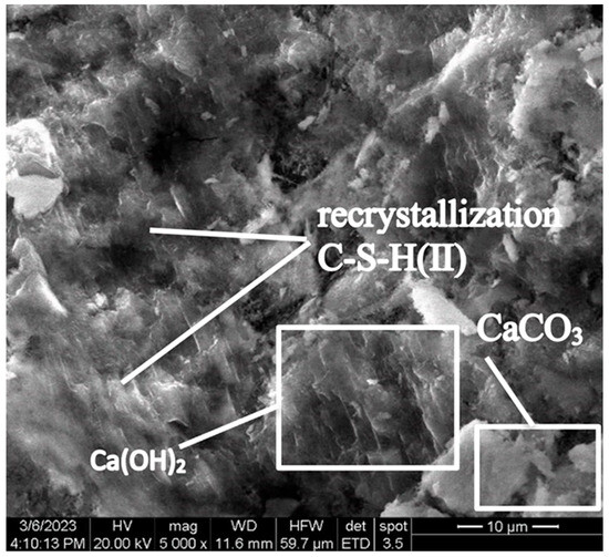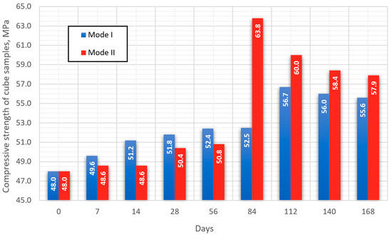 When carrying out model-accelerated carbonation under conditions of elevated temperature, the concrete carbonation process proceeds much more intensely compared to classical accelerated carbonation. In the period up to 28 days of testing, the transition of ettringite to monosulfate leads to the microstructure decompression of mode II samples, which leads to a decrease in their compressive strength in comparison with mode I samples (Figure 6).